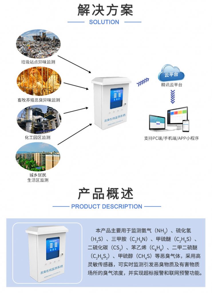 惡臭在線監(jiān)測(cè)系統(tǒng)是基于電化學(xué)和PID檢測(cè)技術(shù)而研發(fā)的大氣環(huán)境監(jiān)測(cè)系統(tǒng)。惡臭在線監(jiān)測(cè)系統(tǒng)可實(shí)時(shí)監(jiān)測(cè)引發(fā)惡臭物質(zhì)及有害物質(zhì)場(chǎng)所的臭氣濃度,可監(jiān)測(cè)氨氣、硫化氫 、三甲胺 、甲硫醚、二硫化碳、苯乙烯 、二甲二硫醚 、甲硫醇等惡臭氣體濃度,并具有超標(biāo)報(bào)警和聯(lián)網(wǎng)預(yù)警功能。該臭氣檢測(cè)儀廣泛應(yīng)用于引發(fā)惡臭的物質(zhì)及有害物質(zhì)的場(chǎng)所。