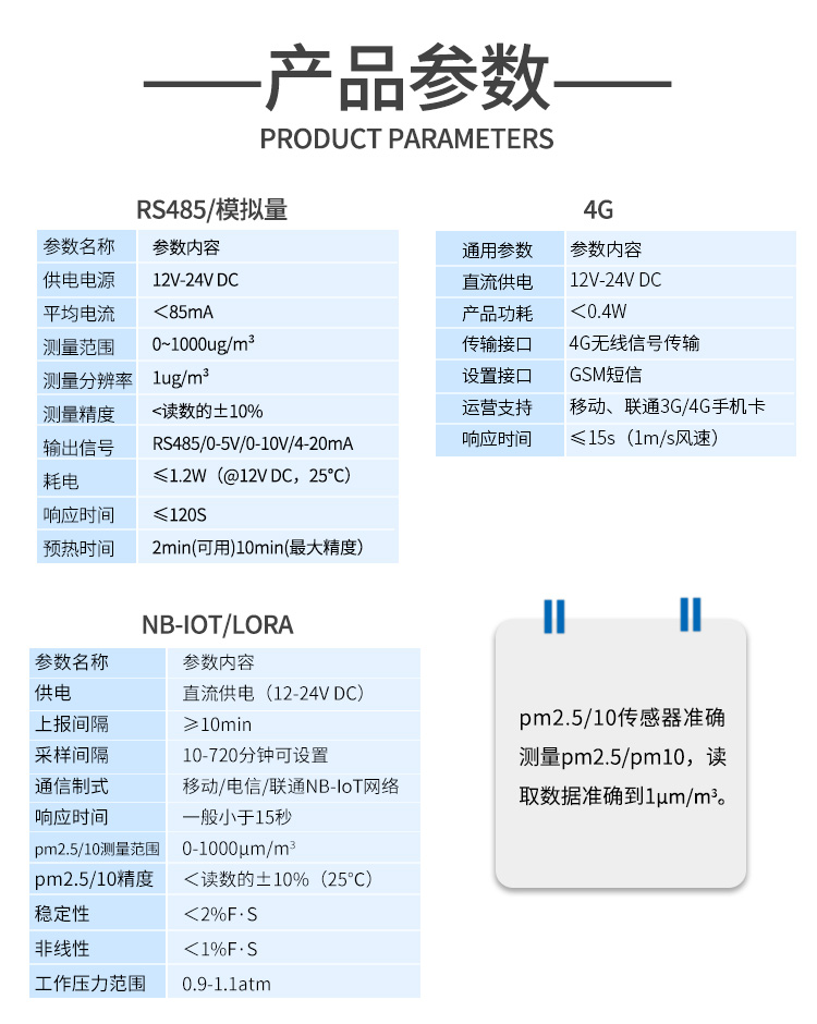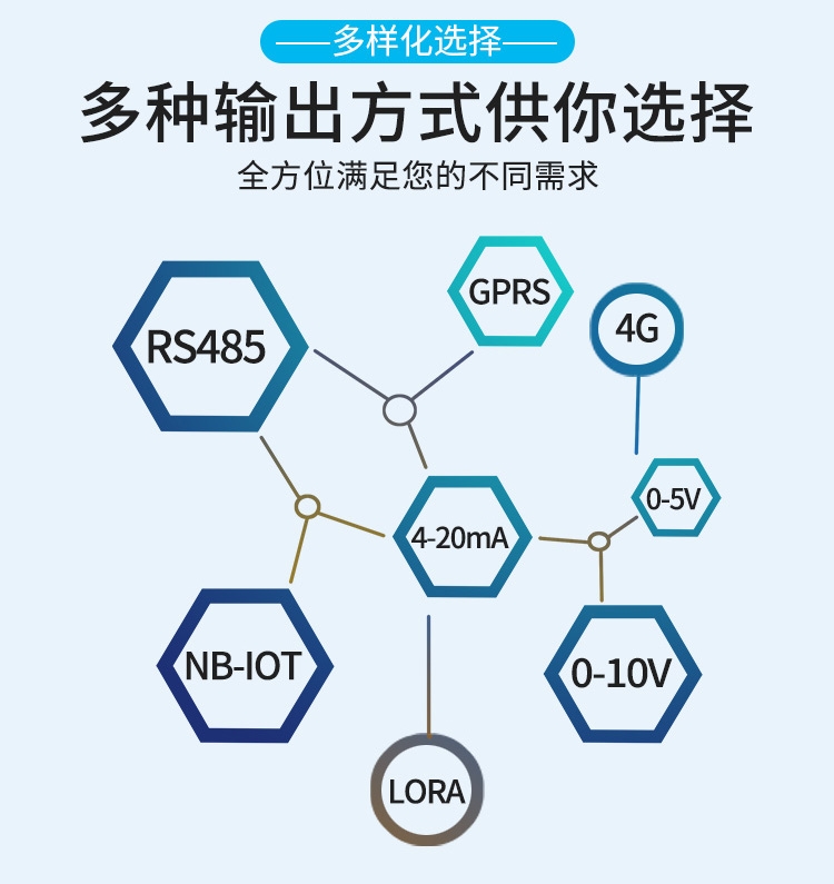1、顆粒物傳感器輸出信號(hào)多樣,支持RS485/4-20mA05V/0-10V/NB-LOT/LoRa/4G等多種信號(hào)輸出,滿足不用環(huán)境需求。
