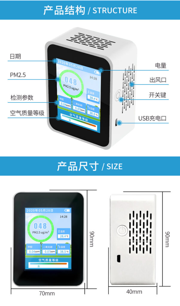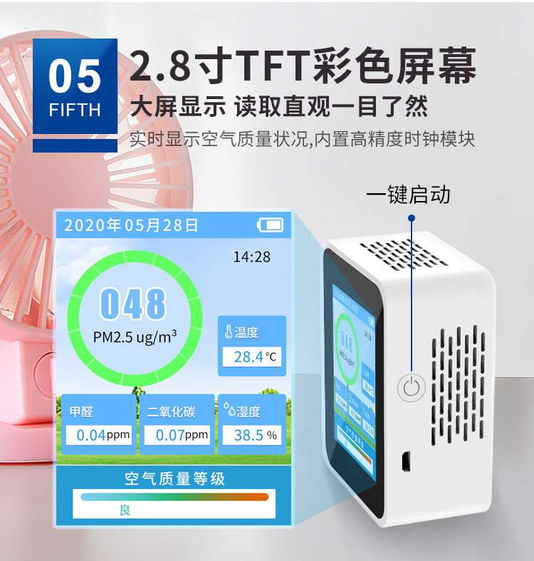 5、2.8寸TFT彩色屏幕,大屏顯示讀取直觀一目了然,空氣質(zhì)量檢測儀實(shí)時顯示空氣質(zhì)量狀況,內(nèi)置高精度時鐘模塊。