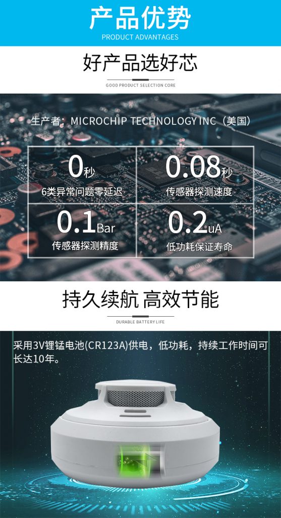 采用3V鋰錳電池(CR123A)供電,低功耗,持續(xù)工作時間可長達(dá)10年。