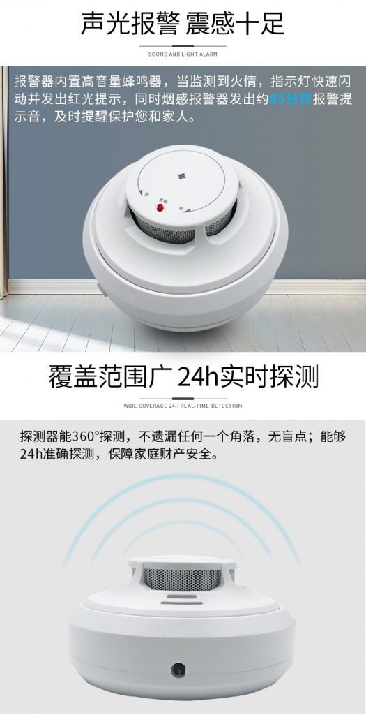 報警器內(nèi)置高音量蜂鳴器,當(dāng)監(jiān)測到火情,指示燈快速閃動并發(fā)出紅光提示,同時煙感報警器發(fā)出約85分貝報警提示音,及時提醒保護(hù)您和家人。