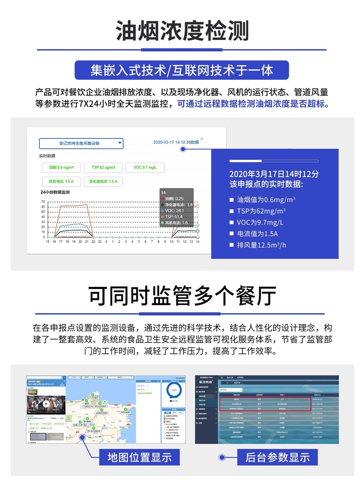 2、可同時(shí)監(jiān)管多個(gè)餐廳:在各申報(bào)點(diǎn)設(shè)置的油煙監(jiān)測(cè)設(shè)備,通過(guò)先進(jìn)的科學(xué)技術(shù),結(jié)合人性化的設(shè)計(jì)理念,構(gòu)建了一整套高效、系統(tǒng)的食品衛(wèi)生安全遠(yuǎn)程監(jiān)管可視化服務(wù)體系,節(jié)省了監(jiān)管部門(mén)的工作時(shí)間,減輕了工作壓力,提高了工作效率。