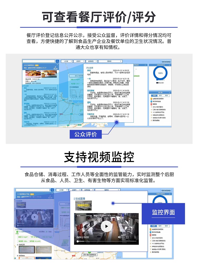食品倉(cāng)儲(chǔ)、消毒過(guò)程、工作人員等全面性的監(jiān)管能力,實(shí)時(shí)監(jiān)測(cè)整個(gè)后廚從食品、人員、衛(wèi)生、有害生物等方面實(shí)現(xiàn)標(biāo)準(zhǔn)化監(jiān)管。