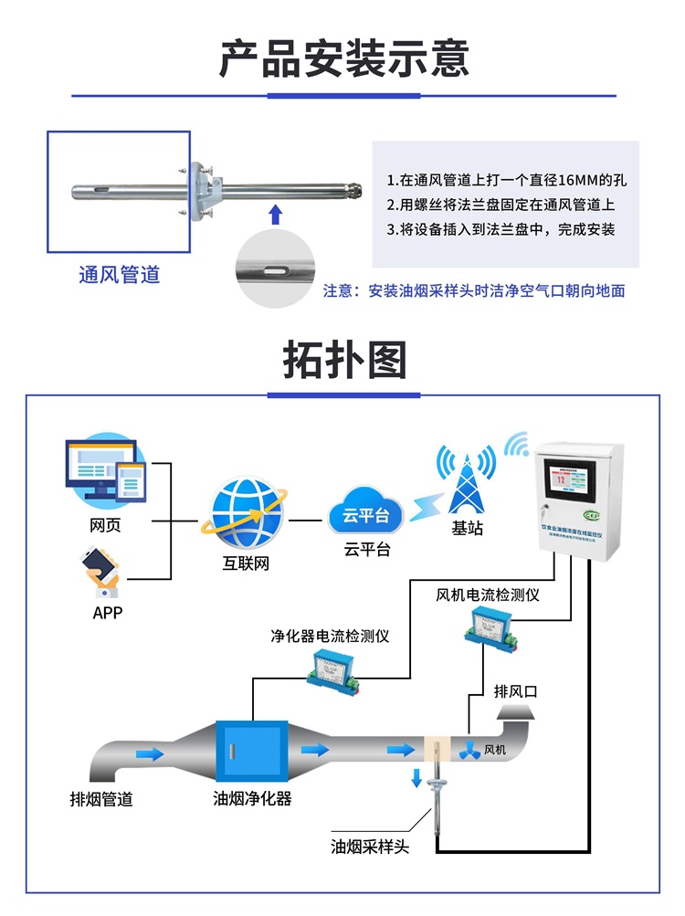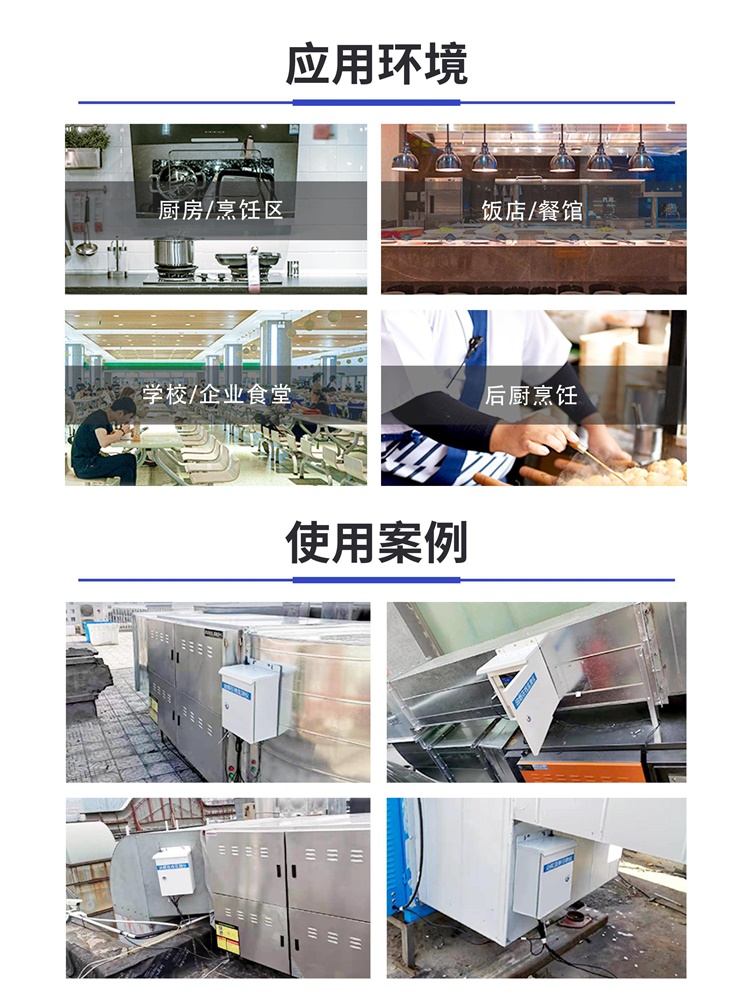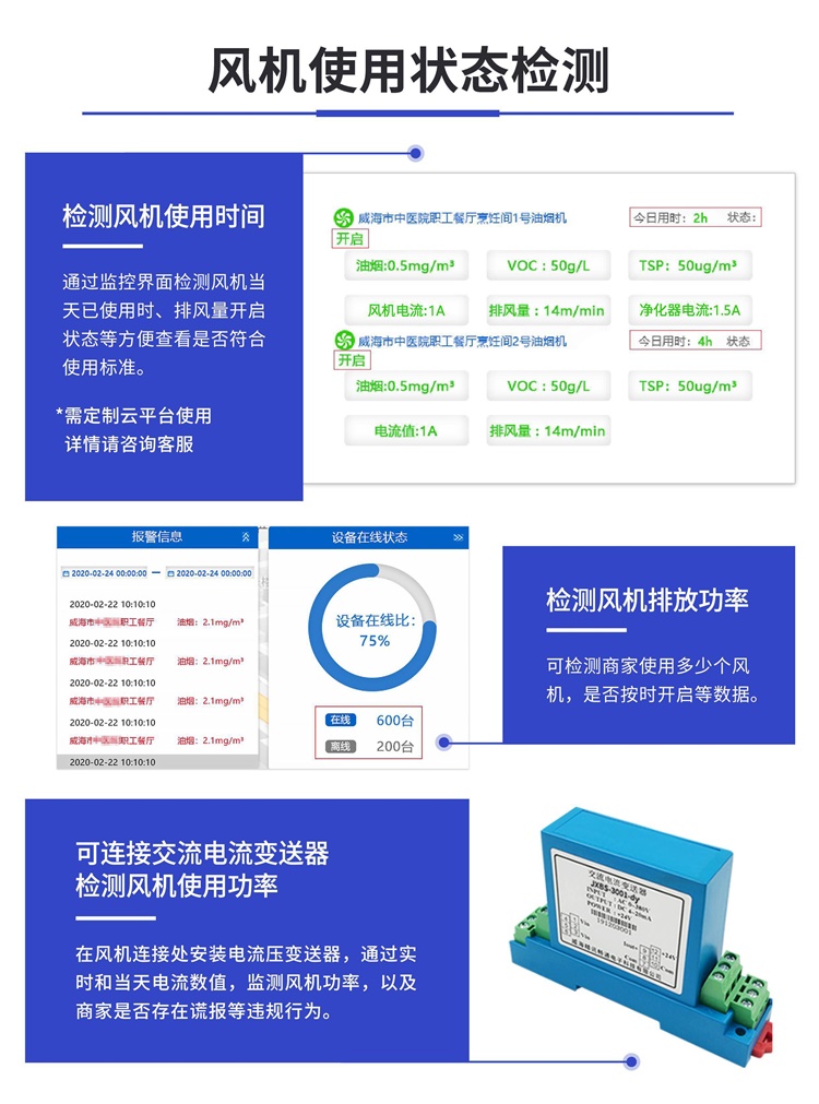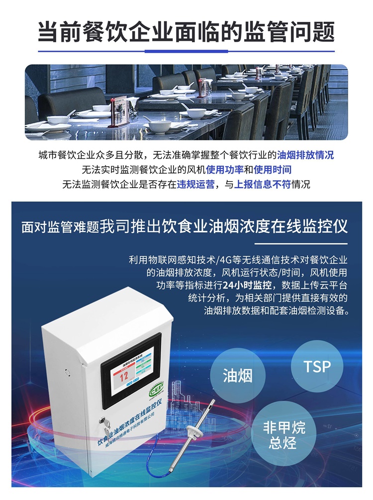 油煙監(jiān)測(cè)系統(tǒng)利用物聯(lián)網(wǎng)感知技術(shù)/4G等無(wú)線(xiàn)通信技術(shù)對(duì)餐飲企業(yè)的油煙排放濃度,風(fēng)機(jī)運(yùn)行狀態(tài)/時(shí)間,風(fēng)機(jī)使用功率等指標(biāo)進(jìn)行24小時(shí)監(jiān)控,數(shù)據(jù)上傳云平臺(tái)統(tǒng)計(jì)分析,為相關(guān)部門(mén)提供直接有效的油煙排放數(shù)據(jù)和配套油煙檢測(cè)設(shè)備。