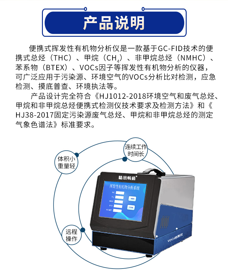 便攜式揮發(fā)性有機化合物檢測儀是精訊暢通基于GC-FID技術(shù)來檢測揮發(fā)性有機物的空氣質(zhì)量檢測儀。便攜式揮發(fā)性有機化合物檢測儀可檢測攜式總烴.