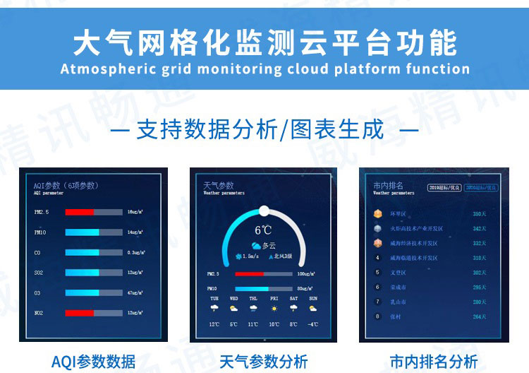 監(jiān)測類型:溫濕度、噪音,AQI六參數(shù)(PM2.5、PM10、NO2、CO 、SO2、O3)。