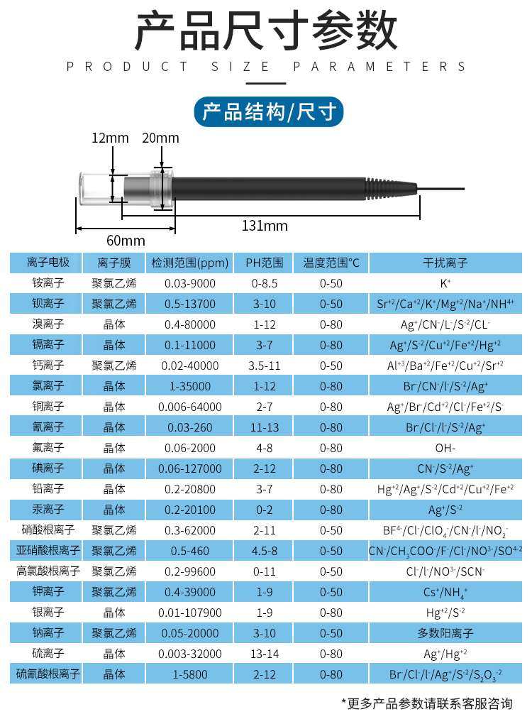 | 離子電極 | 離子膜 | 檢測范圍(ppm) | PH范圍 | 溫度范圍°C |
